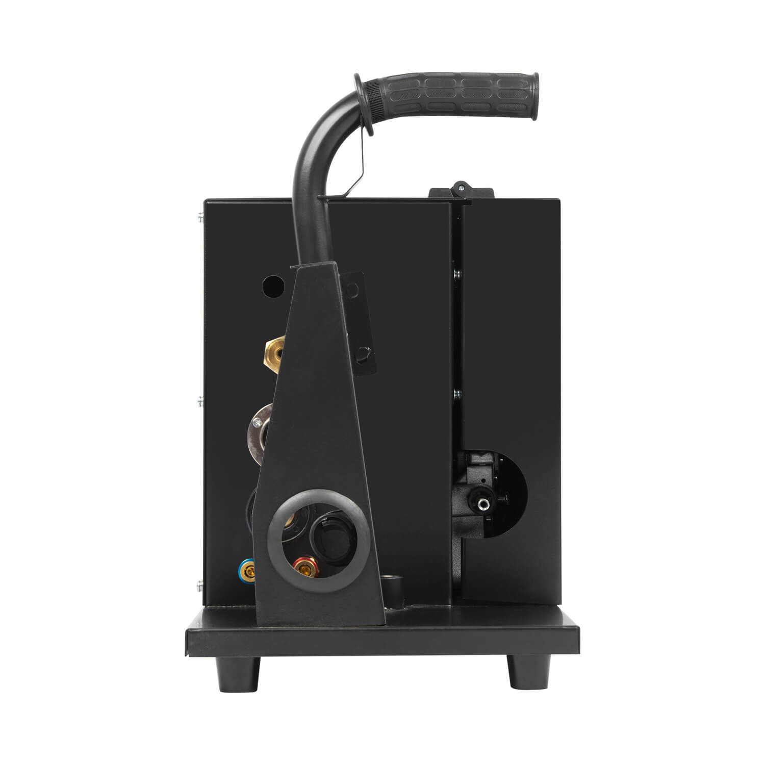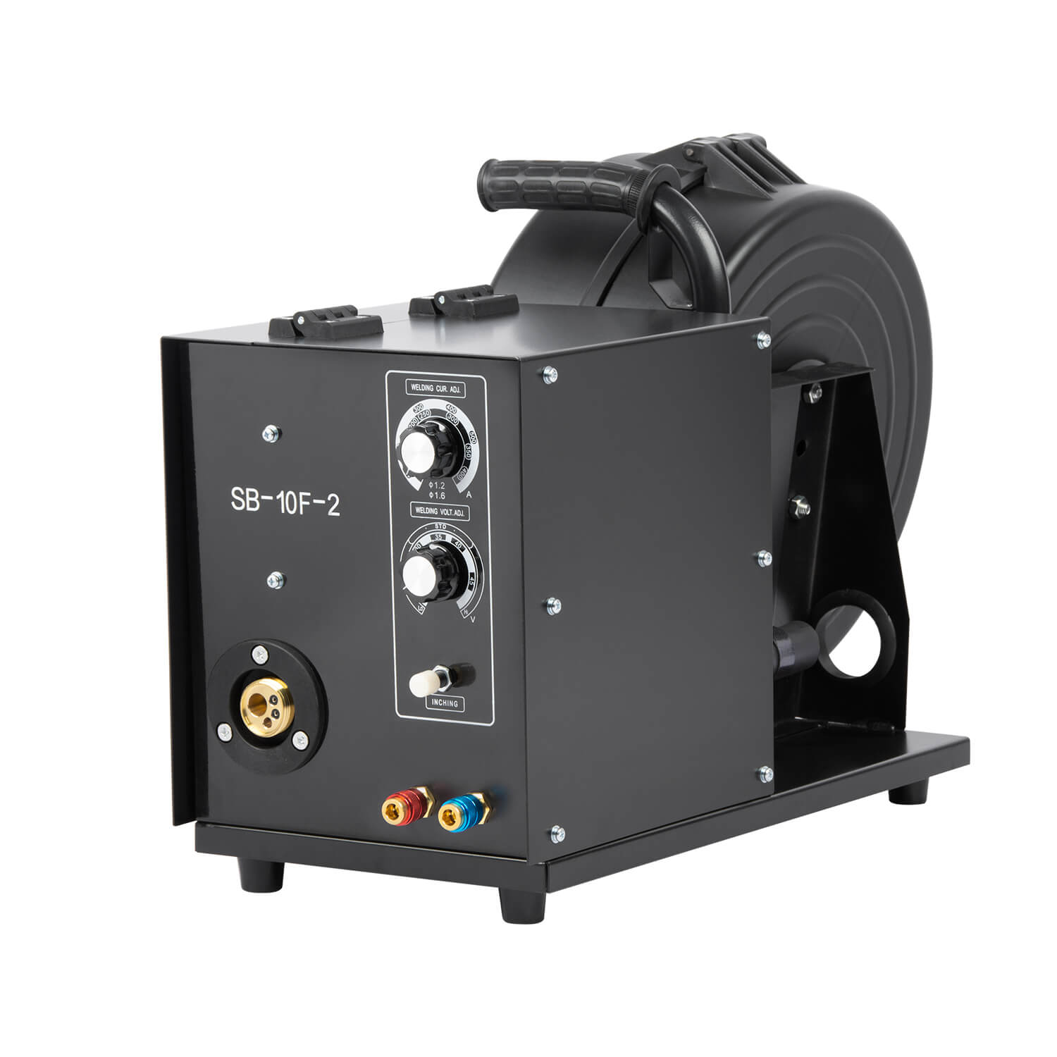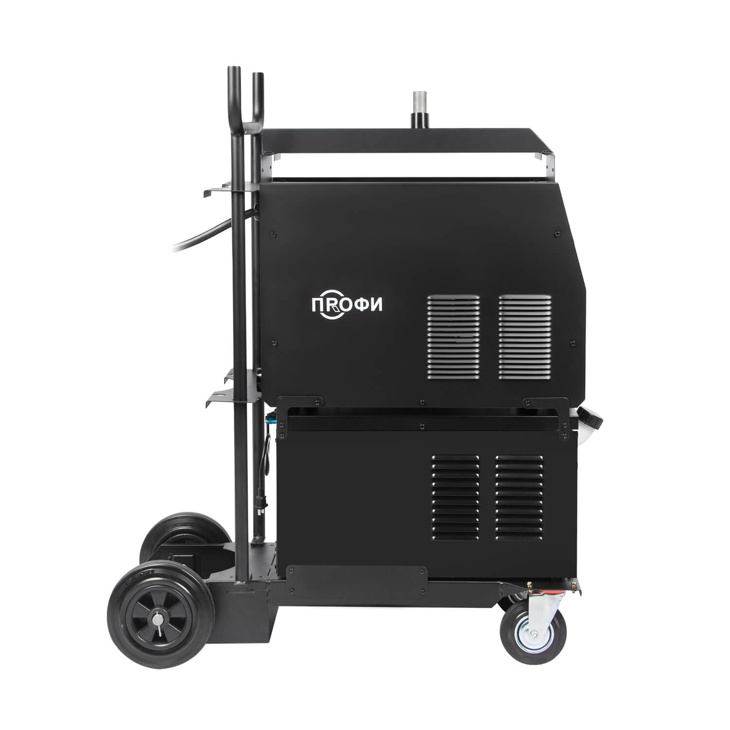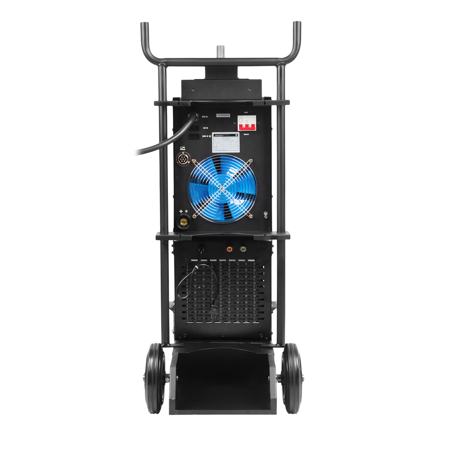 - Тележкадля перемещения аппарата, механизма подачи проволоки, газового баллона и комплектующих. Тележка оснащена передними вращающимися колесами с тормозом и высокими устойчивыми задними колесами.
